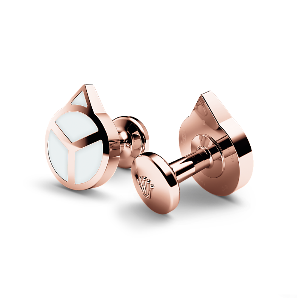 Rolex cufflinks made of 18 ct Everose gold that echo the hour hand found on Professional Rolex watches, equipped with a Chromalight display.